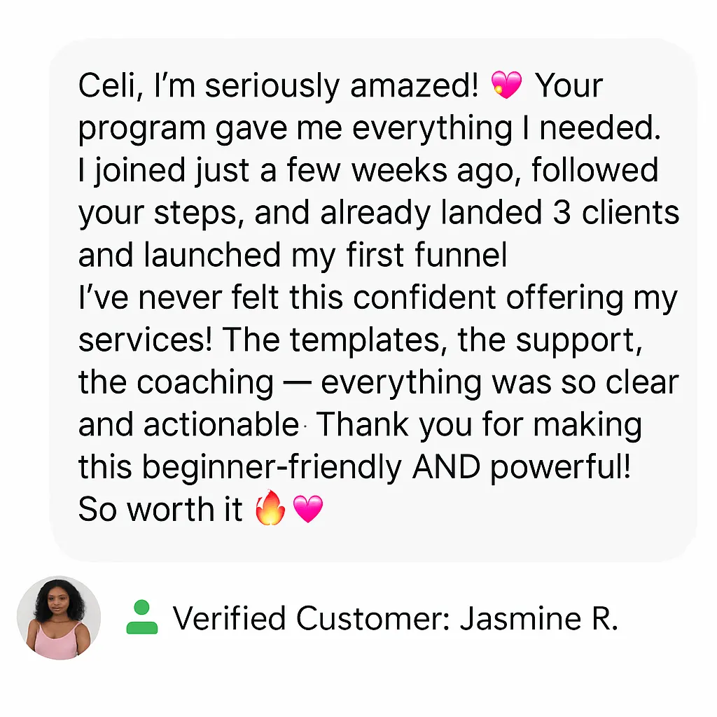 Before this, I had no idea what to sell or how any of this worked. I kept second-guessing myself and thinking I wasn’t ready. But the way Celi teaches just made everything click. Now I not only know what my niche is, but I’ve built an offer I’m proud of and actually feel like I am the expert people want to learn from.